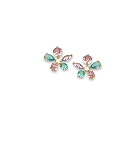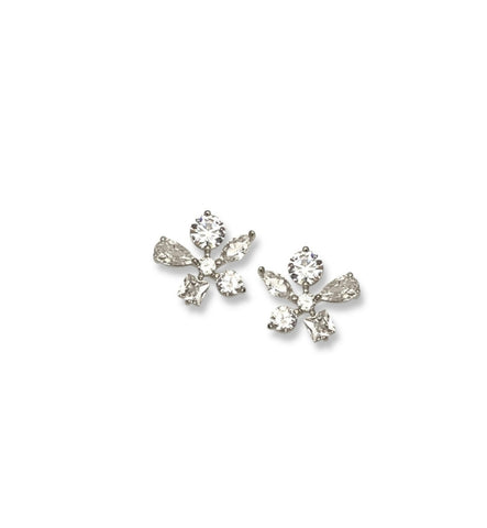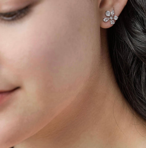 Mollie flower stud earrings, delicate petals crafted from hand-set, high-quality CZ in round, pear, marquise, and princess cuts, Gold or White Gold finish