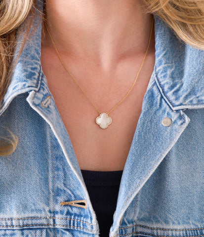 A single mother of pearl clover trimmed in sparkle sits on a dainty gold-plated chain. Match it with the bracelet for the sweetest duo.