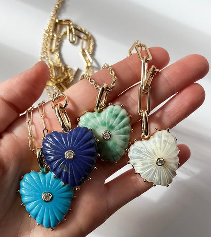 Materials: 14k gold plated, hand-carved green dot jasper, lapis or mother of pearl, cubic zirconia