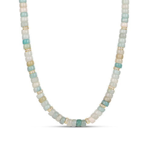 Fresh, serene, and effortlessly elevated. The Sage On The Rocks Necklace features natural stone beads in soft sage, seafoam, and neutral tones, accented with signature pavé spacers for a refined touch of sparkle. The calming color palette paired with polished gold details creates a modern yet organic feel—perfect for everyday wear, layering, and effortless styling. Subtle, chic, and undeniably amazing.
