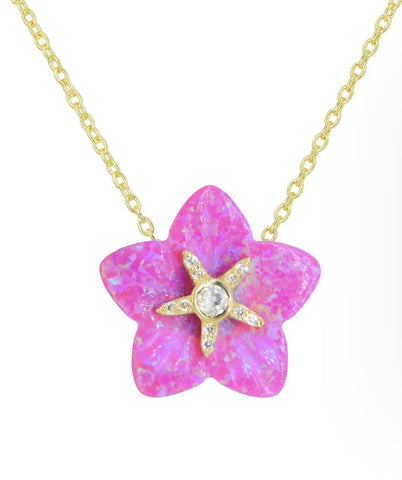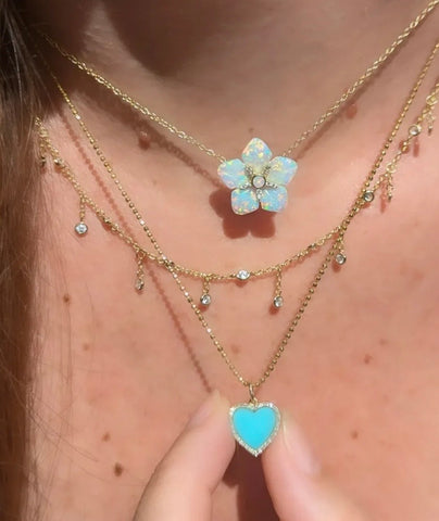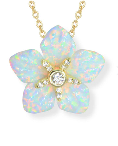 The most beautiful and delicate opal flower necklace is made with lab-created opal and set in 925 sterling silver. The flower is carved and has pave crystal in the inner petals for an added sparkle. Pair this necklace with our opal chokers or your favorite gold chain for a fun layered look.