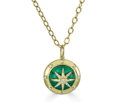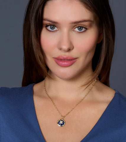 A polished lapis or malachite pendant detailed with a compass motif, symbolizing guidance and new journeys. Suspended from a delicate gold chain, it’s a meaningful piece that adds a touch of vibrant green to any look.